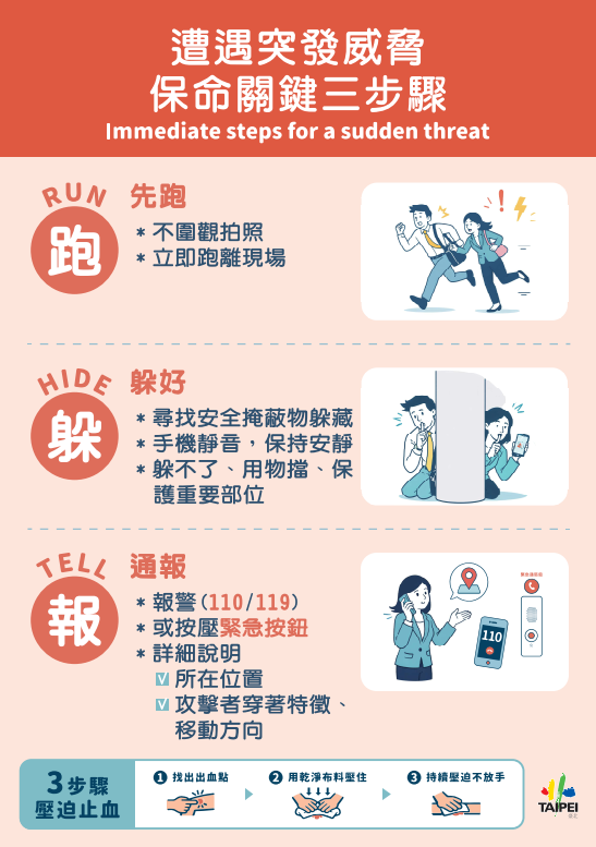 「跑、躲、報!遭遇突發威脅,保命關鍵三步驟」 臺北市政府針對各項可能危安情形,製作無差別攻擊事件之全民應變指引圖卡: 「跑」:遭遇突發威脅,先跑,不要圍觀拍照,立即跑離現場。 「躲」:躲好,尋找安全遮蔽物躲藏,手機調整靜音,保持安靜。如躲不了,使用物品阻擋,並保護重要部位。 「報」:通報,於確認自身安全後,立即報案(110或119)或按壓緊急按鈕,詳細說明所在位置、攻擊者穿著特徵或移動方向,以利後續追查。 為加強市民自我保護及應變意識,市府將透過鄰里系統、學校及各種與民眾接觸之場合,加強全民應變指引圖卡宣導📣 如遇突發威脅,請儘速躲離並隨時留意周邊狀況,以確保自身安全。